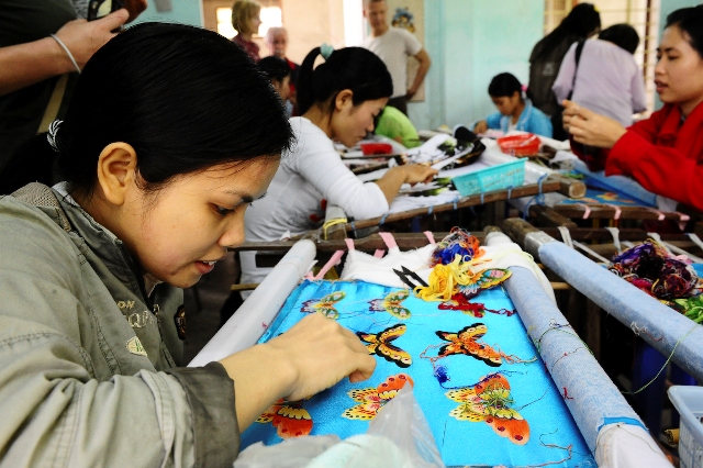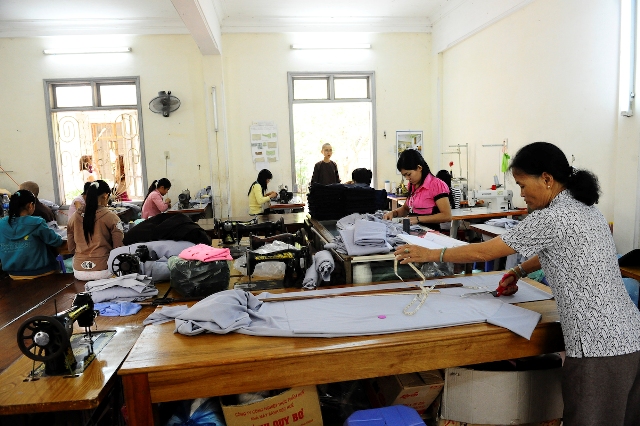 In ihrer Pagode Tay Linh bietet sie armen und körperlich behinderten jungen Frauen die Möglichkeit einer Berufsausbildung. Sie können in einer Schneiderwerkstatt und Stickerei ausgebildet werden oder einen halbjährlichen Abendkurs in EDV belegen. Durch die Spenden bekommen sie die Chance, aus dem Teufelskreis der Armut herauszukommen. Von den Geldern werden die Lehrer und Arbeitsmittel sowie die Löhne der Lehrlinge bezahlt. Wie wir beobachten konnten, sind sie hochmotiviert und mit Begeisterung bei ihrer Arbeit. Behinderte hätten sonst kaum die Möglichkeit auf eine Ausbildung. Einige der Näherinnen und Stickerinnen bekommen eine Anstellung und bleiben viele Jahre dort. Sie können somit ihre Familien, die teilweise auf dem Land leben, mitversorgen und später ihren eigenen Kindern eine bessere Zukunft sichern.