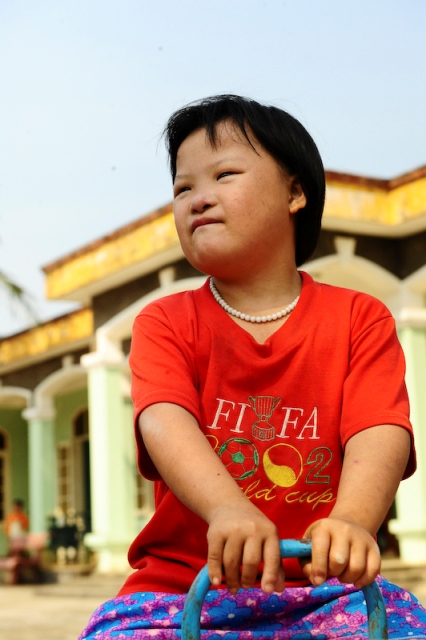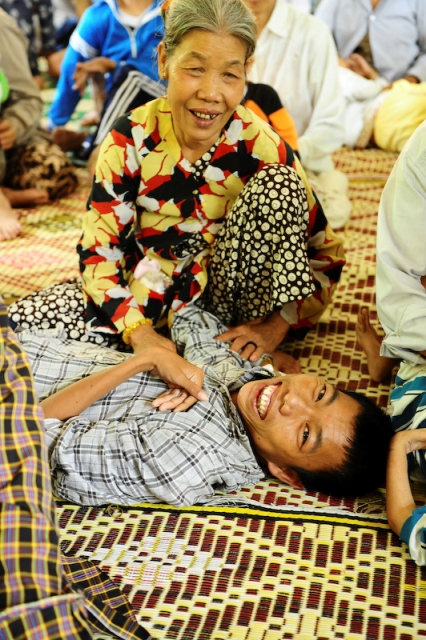In der Umgebung Gio Linh besuchten wir ein Tagesheim für behinderte Kinder. Unter ihnen waren einige, die durch das im Krieg eingesetzte Dioxin genetisch bedingte Mißbildungen hatten. Die Äbtissin Ni Su Nhu Minh unterstützt auch diese Einrichtung. Hier werden die Kinder ganztägig betreut, damit die Eltern die Möglichkeit haben zu arbeiten und ihren Lebensunterhalt zu verdienen. Wir konnten beobachten, wie eng und intensiv der Kontakt zwischen den Müttern und den zum Teil extrem missgebildeten Kindern ist. Die Familien bekamen Geldspenden und ein paar Süßigkeiten.