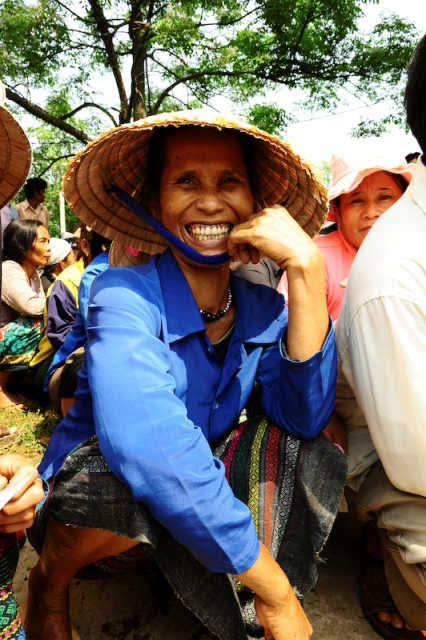 Die Provinz Quang Tri gehört zu den Gebieten, die vom Vietnamkrieg am stärksten betroffen waren. Wir besuchten die Dörfer Linh Thuong und Vinh Truong. Dort konnten durch eure Hilfe lebensnotwendige Grundnahrungsmittel wie Öl, Reis, Nudeln und Sojasauce an die Hilfebedürftigen verteilt werden. Hier leben hauptsächlich ethnische Minderheiten und ältere Menschen. Der immer noch mit Pestiziden verseuchte Boden macht den Landbau nur schwer möglich. Viele Menschen haben nur wenig zu essen und sind daher auf regelmäßige Lebensmittelspenden angewiesen.Wie auf dem Foto zu sehen, war auch hier die Freude über unsere Ankunft groß. Die Lebensmittelverteilung war gut organisiert. Die Menschenmenge löste sich schnell auf, um die Habseligkeiten in ihre bis zu 5km entfernten, in den Bergen gelegenen Häuser zu bringen.
