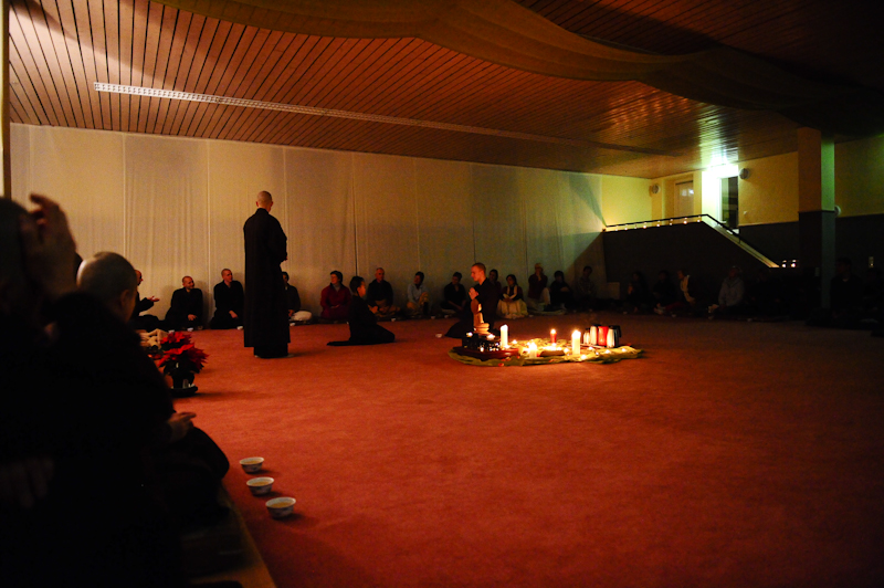Am Sylvesterabend saßen wir Mönche und Nonnen der Pagode Phat Hue, alle Teilnehmerinnen und Teilnehmer des Winter-Retreats und alle weiteren Bewohner unseres neuen Zentrums Buddhas Weg in der Buddhahalle in einem großen Kreis beisammen. In unserer Mitte stand eine Buddhastatue, umringt von Kerzen, Blüten und farbenfroher Dekoration. Die Atmosphäre der Buddhahalle war von Besinnlichkeit und Ruhe geprägt. Denn wir hatten uns dazu entschlossen, den Jahreswechsel besinnlich zu erleben.