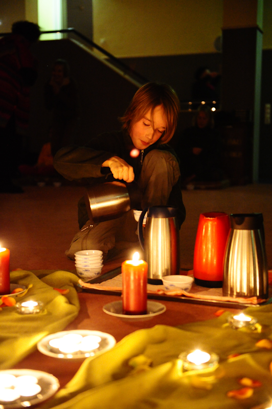 So meditierten wir zunächst gemeinsam und teilten danach die große Anzahl von Personen in kleinere Gruppen auf – wir waren mit Sicherheit an die 50 Personen. In den kleineren Gruppen teilte nun jeder sein liebstes, bedeutsamstes oder lustigstes Ereignis des vergangenen Jahres mit. Man erinnerte sich an schöne und bewegende Begegnungen, tiefe und berührende Gespräche, Momente kleinen und großen Glücks. Und nicht nur die sich erinnernde Person konnte das Glück noch einmal erleben – auch wir zuhörenden fühlten mit, spürten die Freude und das Lachen unseres Gegenübers. Diese Runde stimmte unsere Herzen auf den Hauptteil des Abends ein: Die traditionelle, asiatische Teezeremonie.