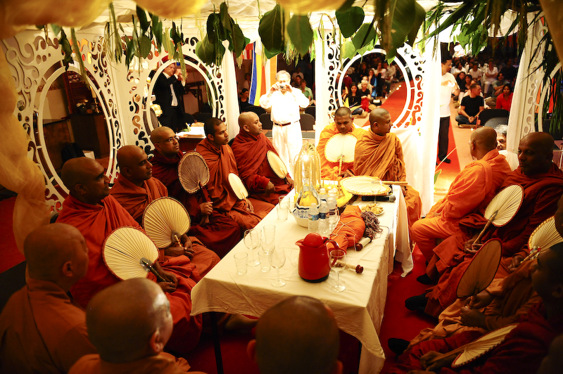 Schon am Nachmittag trafen die Gäste ein: singalesische Famlien die sich auf ein Stück Tradition ihrer Heimat freuten, neugierige Besucher die ein erstes Mal kommen, Freunde die das Erlebnis des letzten Jahres noch in guter Erinnerung hatten – und immer mehr Mönche aus allen Teilen Europas in ihren safran oder weinroten Theravada Gewändern.