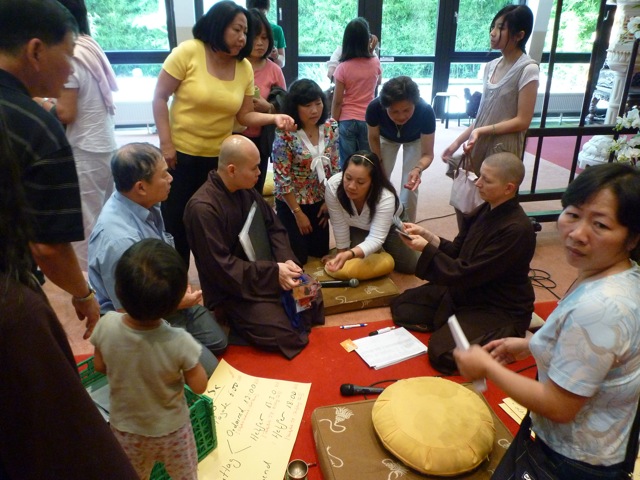 Für alle Fragen werden Lösungen gefunden und in diese Lösungen sind immer Menschen involviert, die Verantwortung übernehmen. Wo Arbeit ansteht macht sich Freude breit. „Ja, ich will um 6 Uhr Frühstück machen“ rufen mehrere Frauen begeistert und fügen hinzu : „wir bringen noch Freundinnen zum Helfen mit“. Jugendliche werden eingeteilt, um die ortsunkundigen Besucher mit der Bahn in das Stadion zu begleiten und einige Männer haben sich schon gerüstet, um die Frühstückszelte vor der Pagode aufzubauen. Alle wollen sich engagieren. Bei allen ist die Einmaligkeit und die Bedeutsamkeit dieses Besuches seiner Heiligkeit hier in Frankfurt zu spüren. Und auch die Freude, diesen Besuch als Mitglieder und Freunde der Pagode möglich zu machen, wird nicht verborgen.